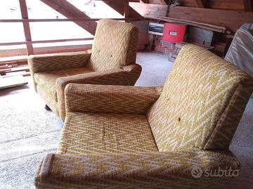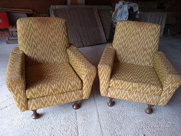 Due poltrone vintage con motivo geometrico giallo e bianco, tipiche degli anni '70. Struttura in legno solida e resistente. Il tessuto, nonostante gli anni, si presenta ancora in ottimo stato.