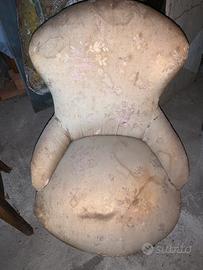 Da fare: pulizia profonda, rifacimento tappezzeria completa (tessuto macchiato, sporco, aloni e consumato), eventuale ritocco doratura.