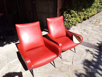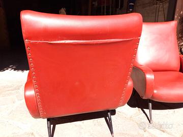 Coppia di poltrone vintage anni ’50/’60 in stile mid‑century modern. Struttura solida e schienale curvo tipico dell’epoca. Rivestimento originale in similpelle rossa, da restaurare o rifoderare: presenti segni d’uso e uno strappo su un bracciolo come da foto. prezzo riferito alla coppia.