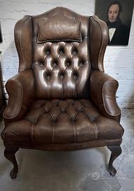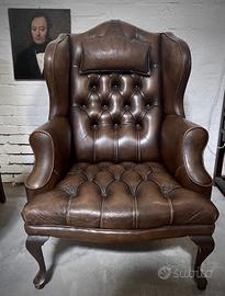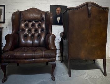 Eleganza Country House Inglese: coppia di poltrone Wingback capitonné con poggiatesta contrappesato, Inghilterra, prima metà del XX secolo Raffinata coppia di poltrone “Wingback armchairs”, modello iconico dell’arredo tradizionale britannico, noto in ambito francese come “fauteuil Bergère à oreilles”, caratterizzate da uno schienale alto sagomato con pronunciati fianchi laterali avvolgenti (“wings”), concepiti per offrire protezione dalle correnti e creare una seduta raccolta e confortevole, elemento distintivo degli interni delle country house inglesi. Il rivestimento, di grande qualità e piacevole resa estetica, presenta un’elegante lavorazione capitonné profonda e regolare, realizzata secondo la migliore tradizione artigianale, mentre la seduta ampia e accogliente poggia su gambe anteriori sagomate di gusto Queen Anne, conferendo all’insieme slancio e armonia formale. Il retro è rifinito con file di borchie decorative, ulteriore elemento distintivo della produzione anglosassone di qualità. Le poltrone sono inoltre dotate di originali poggiatesta mobili con contrappeso integrato, accessorio funzionale e raffinato, progettato per garantire sostegno ergonomico e regolazione naturale. Per tipologia costruttiva, proporzioni e qualità esecutiva, la coppia può essere attribuita con buona probabilità alla produzione inglese della prima metà del XX secolo, nel solco della tradizione tardo Edwardiana e delle interpretazioni country house. Lo stato di conservazione è buono, con normali segni d’uso coerenti con l’età che contribuiscono al fascino autentico e alla patina decorativa dell’insieme. Queste poltrone rappresentano un perfetto equilibrio tra eleganza formale, comfort e tradizione, ideali per ambienti classici, studi professionali o residenze di campagna, nonché per collezionisti e appassionati di arredi di gusto britannico.