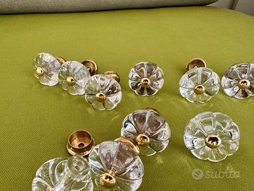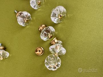 Vendo sette pomelli completi, maniglie trasparenti a forma di fiore con anima in metallo color oro, che gli dona particolare resistenza.