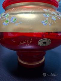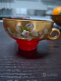 Porta un tocco di eleganza senza tempo alle tue serate con questo splendido set da poncho vintage in autentico Vetro di Murano, creato dalla rinomata ditta Mello Figli negli anni '60. Un pezzo unico per collezionisti e amanti del design raffinato. Il set include: 1 Elegante coppa da poncho con coperchio e mestolo (lievementw danneggiato vedi foto) 5 Tazze coordinate con manico dorato Dettagli che fanno la differenza: Vetro di Murano autentico: Realizzato a mano dai maestri vetrai di Murano, rinomati in tutto il mondo per la loro maestria e qualità. Design Mello Figli: Un design esclusivo degli anni '60, caratterizzato da un'elegante decorazione floreale in oro 24K, un colore rosso intenso e una forma classica e raffinata. Oro 24K: L'abbondante applicazione di oro zecchino conferisce al set un'eleganza senza pari e un valore intrinseco.