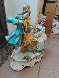 Statuetta in ceramica raffigurante una coppia in abiti settecenteschi impegnata in una scena musicale. L'uomo suona il violino, mentre la donna è seduta al pianoforte. Con dettagli elaborati e colori vivaci. La base presenta decorazioni floreali in rilievo. Oggetto ideale per collezionisti o per arredare con un tocco classico ed elegante.