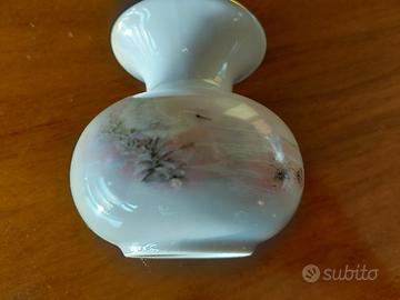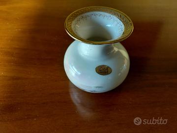 piccolo vaso in porcellana di Limoges, Francia, caratterizzato da un bordo dorato e una decorazione paesaggistica dipinta a mano.