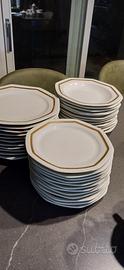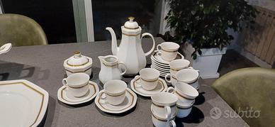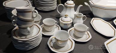 Vendo set porcellana fine a forma ottagonale, bianca con bordo d'orato e incisione a corda sul bordo composto da: 12 piatti fondi 11 piatti piani 12 piattini dolce/ frutta 1 zuppiera 3 piatti da portata 11 tazze da te con 12 piattini 1 zuccherina 1 lattiera 1 teiera 12 tazze da caffè con 12 piattini 1 zuccherina 1 lattiera 1 caffettiera