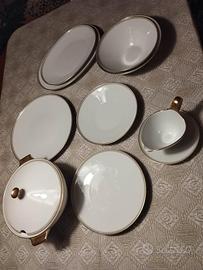 per 8 persone compreso di piatti per secondi, piatti zuppa, zuppiera con coperchio, 2 ciotole, 1 piattone grande, 2 piatti da portata ovali, 1 sauciere, piattini dessert, sottopiattini, tazza caffé, zuccheriera, brocca latte e brocca caffé