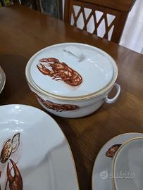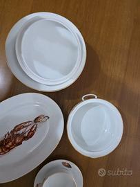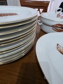 PORCELLANA RICHARD GINORI SERVIZIO DA 12 FANTASIA ASTICE Servizio di piatti vintage da pesce/crostacei per 12 persone composto da 16 pezzi, di cui: un vassoio ovale grande da portata; una salsiera, una zuppiera con coperchio ed 12 piatti piani. Il servizio è realizzato dalla manifattura Richard Ginori in porcellana bianca e profili dorati con impresse immagini di aragoste/crostacei. Condizioni ottime.