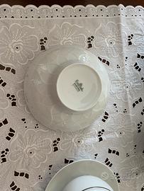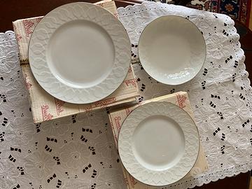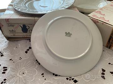 Servizio di piatti Lotus ( n. 64 pezzi) in porcellana Rosenthal in ottimo stato, color bianco con bordino argentato, composto da : - 3 terrine da verdura (21x12 - 19x11 - 17x9%); - 1 ciotola (14x11); - 1 zuppiera (19x22); - 3 piatti per carne ovali (39x23,50 - 33,50x 20- 24,50x12); - 2 piatti rotondi da torta (diam. 28,5); - 18 piatti piani (diam. 25 cm); - 18 mini piatti (diam. 21 cm); - 18 piatti fondi (diam. 20 cm).