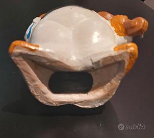 Delizioso porcellino violinista, che strizza simpaticamente l’occhiolino. Un salvadanaio in terracotta col tappo sul fondo, per poter accedere al “tesoretto” senza bisogno di rompere la statuetta. Il porcellino violinista è elegante, nel suo completo bianco a righe azzurre e indossa una paglietta marrone chiaro, dello stesso colore del violino. Sul retro del capo c’è la fessura da cui introdurre monete e banconote. Pesa 296g ed è alto 16cm, su una base di 10cm x 7cm, mentre il diametro massimo costituito dal girovita arriva a 10cm. Simpatica idea regalo.
