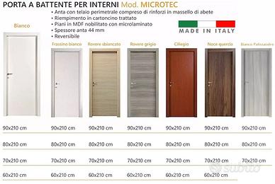 Porta a battente microtec anta con telaio perimetrale compreso di rinforzi in massello di abete, riempimento in cartoncino trattato, piani in MDF nobilitato con microlaminato. Reversibile. Colori bianco frassino, rovere sbiancato, rovere grigio, ciliegio, bianco, noce quercia, palissandro bianco.