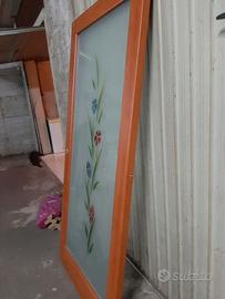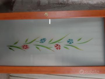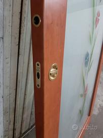 Porta a scrigno usata e in ottime condizioni, legno e vetro satinato con rifiniture floreali, con carrello di aggancio, misure H 210, L 103, senza cornici .