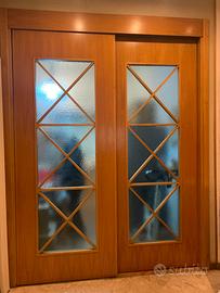 Porta artigianale in legno con ante scorrevoli legno e vetro dimensioni ante h cm 264 larghezza cm 210 di luce, altezza totale con fascione superiore cm 280 larghezza totale incluse mostre laterali cm 264 euro 1000 trattabili. Ottime condizioni. Cell 3735517761