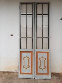 Porta antica con decori sui pannelli da entrambe le parti,vetri due file piu in basso ofuscati e due file più in alto trasparenti. Tutto originale . Molto alta misure in foto.