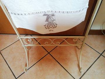 Vendo portasciugamani bagno, in stile shabby chic, color avorio, in ferro. Ci stanno varie misure di asciugamani. Comodo anche da mettere in camera per mettere l'abbigliamento alla sera quando ci si cambia. Misure: altezza cm. 98,larghezza cm. 45,5 e profonditá cm. 32. Si é tolto un pó il colore dovuto all'usura,(vedi ultime foto), basta ritoccare con una bomboletta spray dello stesso colore. Ci sta in auto per il ritiro, sia nel bagagliaio, sia sul sedile posteriore o il sedile davanti abbassando lo schienale.