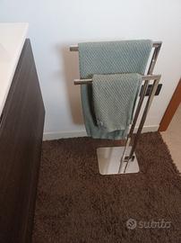 Piantana porta asciugamani da terra in ottime condizioni, in acciaio lucido cromato, misura altezza 78 cm da terra per asciugamano grande e 68 cm da terra per asciugamano piccolo. Base 20 x 25 cm. Visione e ritiro a Castello di Godego no spedizione