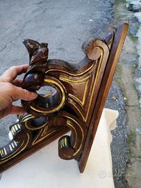 Bellissima coppia di porta asta da tenda in legno intagliato con dorature, no difetti, primi 900.