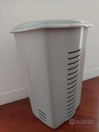Porta biancheria CURVER in plastica color grigio. Ha fessure su ogni lato. È in ottime condizioni salvo uno spacchetto sul coperchio come ho evidenziato nella fotografia