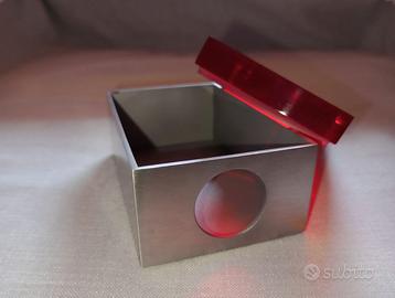 Elegante e moderno porta business cards da scrivania firmato Arch. Page Goolrick. Acciaio e plexiglass. Edizione limitata. Spese spedizione a carico acquirente.
