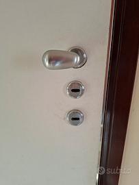 Porta blindata funzionante con doppia serratura a chiave lunga. Il pannello esterno è lievemente danneggiato all'altezza della maniglia