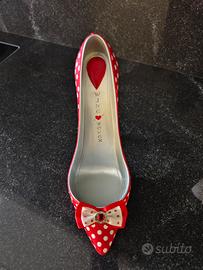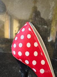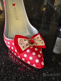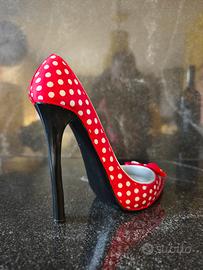 Porta bottiglia a forma di scarpa tacco da donna elegante colore rosso con poiss bianchi. Oggetto acquistato ad un mercatino Vintage, pezzo raro realizzato con base in plastica e rivestimento in tessuto di colore rosso a poiss (pallini), molto resistente e ben curato con base di appoggio solida, difficile farlo cadere. La scarpa con tacco può contenere una bottiglia di vino da 750ml con diametro base fino a 8cm Misure: 22cm lunghezza, 21cm altezza, 10cm larghezza