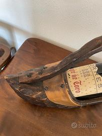 Porta bottiglie in legno a forma di zoccolo. Realizzato in legno scuro intagliato con cinghia in pelle marrone. Oggetto da collezione o decorativo