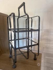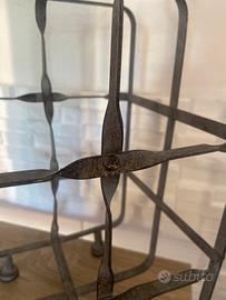 Vendo per inutilizzo un cestello portabottiglie in metallo di fattura liberty. Misure di massima 40 X 20 X 20 cm escluso il manico. Puo’ ospitare 4 bottiglie in verticale oppure 6 in orizzontale