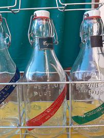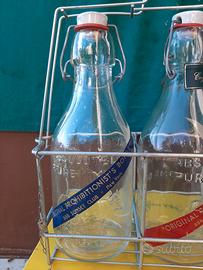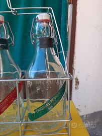Porta bottiglie, con bottiglie in vetro, metà novecento. Lucchettto con chiave di chiusura Misure 34 x32 x12