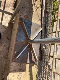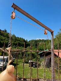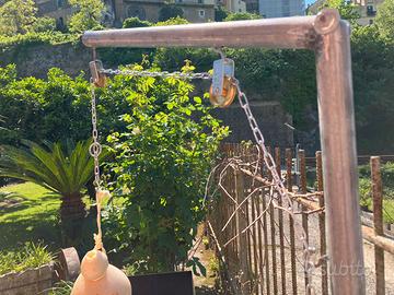 Porta caciotta impiccato girevole e trasportabile, zavorrato con piastra in acciaio fissata a quattro piedi. La piastra si sgancia per consentire agevole trasporto. L’asta ad L puo’ girare intorno al suo asse onde consentire la cottura. Inoltre la catena di sostegno della provola (portata 2,8 kg) scorre su doppia carrucola in metallo per poter gestire la distanza dai piani cottura.