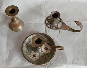 3 portacandele in ottone con decori a smalto o incisioni colorate, porta candela a campana alto 10 diametro 6 cm con campanella funzionante, squillante e decoro grafico a incisione, portacandela con piattino diametro 12 alto 7 cm e portacandela con manico arricciato lungo 15 alto 5 cm, condizioni come da foto, ideali per arredi antichi o taverna, tutto a 10 euro