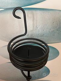 Porta candela da terra in metallo verniciato nero. Base a tre piedi, altezza totale 70 cm, alloggiamento candela diametro 8,5 cm. L’alloggiamento è previsto di un chiodo centrale per fermare la candela.