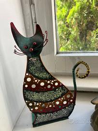 Metallo decorato, porta lumino e candela a forma di gatto, bello anche come soprammobile.