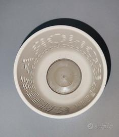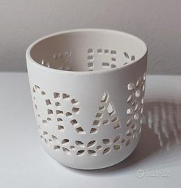 Vendo il porta candela in foto. È in ceramica e vi è traforato il nome Eleonora con dei fiorellini decorativi. Come nuovo, mai usato. Misure 7,5 cm di altezza e 7 cm di diametro.