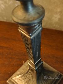La base è ampia e quadrata, mentre il fusto è scanalato verticalmente, terminando in un portacandele svasato.