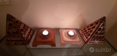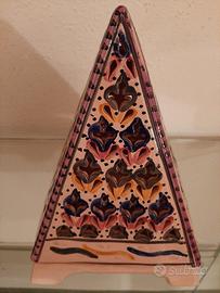 N.2 porta candele a piramide in ceramica hand made stile decorativo artigianale dell' Isola di Jerba dipinto con motivi geometrici stilizzati e colori vivaci misurano ognuno altezza cm22 e base cm 15x15. Composto in due parti base per appoggia candele e piramide che riflette la luce.