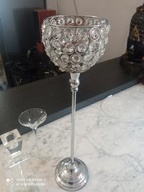 vendo tre stupende porta candele di varie tipologie e materiale uno è in vetro di Murano molto molto leggero bellissima lavorazione delicata. l'altro è in cristallo di Boemia con particolari perline di vetro all'interno dello stelo. l'altro è un portacandele alto in materiale metallico con inserti di pietre trasparenti molto bella la resa con le luci della candele.