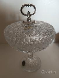 elegante portacaramelle vintage in cristallo di Boemia con coperchio, caratterizzato da lavorazione ad intaglio a mano ("Handschliff"). Cristallo al piombo intagliato a mano con motivi a stella e diamante. presumibilmente risalente alla metà del XX secolo.