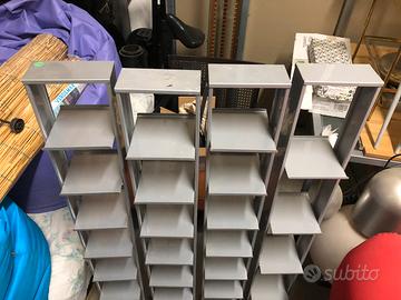 3 porta cd 1 porta dvd e 2 piedistalli per piccole casse. Basi cemento , struttura metallo , H127 cm. Piccoli segni di utilizzo , stato generale ottimo. Ritiro o consegna personale. Vendita garantita con ricevuta fiscale.
