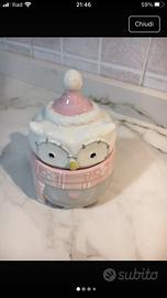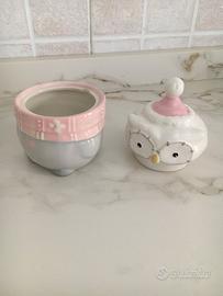 Porta cioccolatini a formadi gufetto in ceramica bianca e rosa.