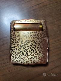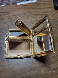 Porta cipria e rossetto con specchio, struttura in ottone con il coperchio decorato a smalto. Si apre con un pulsante sul lato che permette l'accesso al vano interno. Oggetto vintage molto ben conservato, presenta solo il graffio che si vede in foto. Misura: 8,5 x 7,2mm.