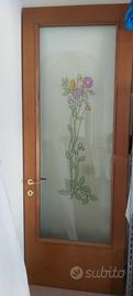 Elegante porta interna in Noce Tanganica con vetro unico decorato artisticamente con fiori, completa di cassaporta e coprifili, verniciata con vernice poliuretanica opaca. Dimensioni: 80x233x28.
