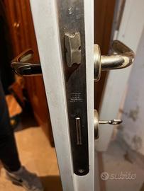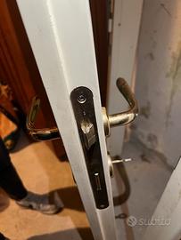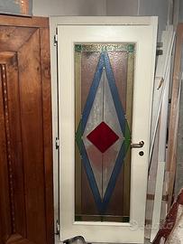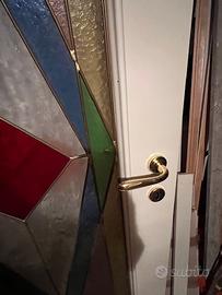 Porta da interno con telaio in legno laccato in bianco avorio Pannello in vetro a diversi colori con profili in ottone e disegno geometrico originale. Maniglia, serratura e chiave in ottone. Realizzazione artigianale. Misura 80 x 200 Solo ritiro nel luogo in cui si trova (zona di Trento) con mezzo adeguato