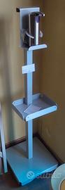 Distributore a colonna per dispositivi di protezione personale, la colonna è costituita da una base quadrata 30 x 30 cm, alta 130 cm con due ripiani porta mascherine e guanti (29,5 x 14,5 cm), nella parte superiore un ripiano per il contenitore del liquido igienizzante per mani (diametro max 9 cm), alla base cestino porta rifiuti. Realizzata in acciaio verniciato a polveri color alluminio goffrato. Completo di dispenser elettronico digitale con azionamento senza contatto.