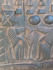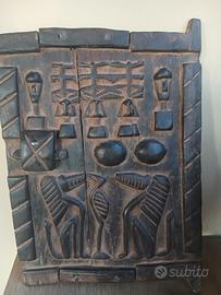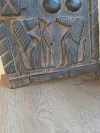 porta del grano etnia dogon del mail. di piccole dimensioni molto bella come complemento da arredo. xx secolo . scolpita interamente a mano con figure in rilievo di animali stilizzati tipiche della loro etnia e serratura a rilievo . pannelli uniti con borchie metalliche. patina compatibile con oggetto vecchio di molti decenni