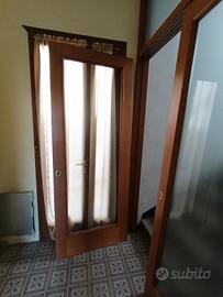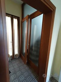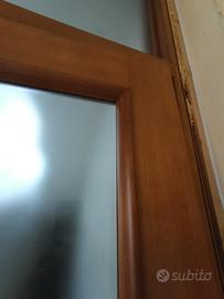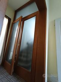 Doppia porta scorrevole con vetrata satinata (non trasparente), struttura in legno color noce. Misure di ciascuna porta: 2,30(h)x0. 90(L)x 4,5cm(p), luce vetro 1,88x61,5 Insieme vendo telaio (stipiti) con vetrata superiore come da foto, l'altezza totale è mt 3.05, possibile riadattamento.