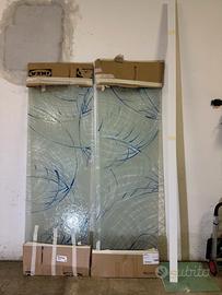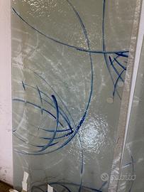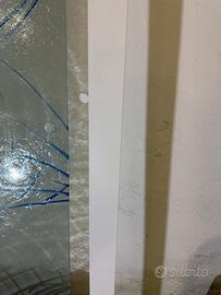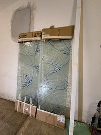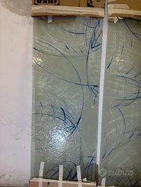 Porta doppia in vetro decorata con binario bianco, tutti gli accessori inclusi, binario, supporto binario, maniglia porta. Misure porte: larghezza singola porta64,5 cm altezza 210 cm Il binario misura 270 cm.