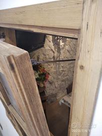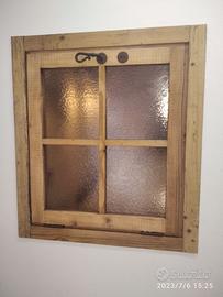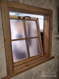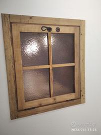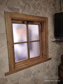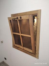 Piccola finestrella costruita in legno di abete vecchio con pattina in tutti i lati e bancalino di appoggio con misura l. 73 h 81,5 prof. 15 + top mensola l. 105 predisposto con top superiore da circa 4 cm (davanzalino) in massello di abete vecchio mentre la finestra avrà una piccola maestà su cui andremmo ad applicare la porta che avrà un telaio con inserito vetro cattedrale e cornicetta croce con relative mostrine tutto in abete vecchio, completo di maniglia serratura e maniglia con aste in ferro vecchio in modo che permetta apertura se anche di poco della finestra. Finitura cerata neutra. Compreso finitura Iva non comprendente, costruito su commissione, non disponibile a magazzino ma possiamo riprodurlo DIRETTAMENTE DAL PRODUTTORE ASTENERSI RIVENDITORI O COMMERCIANTI