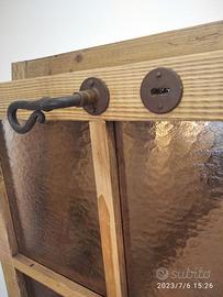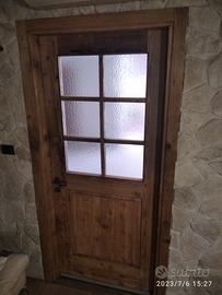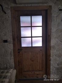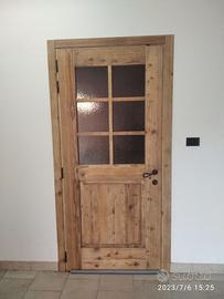 porta completa di maestà in legno di abete vecchio recuperato da trave e parancole da muratore mantenendo la pattina originale che ha fatto il tempo con misure h 211 x 98 prof. 15 la maestà e 4,5 la porta. Costruita con spalle verticali da circa 12 cm con fascia orizzontale superiore centrale e inferiore, in cui nella parte sotto troveremo pannello bugnato diamantato mentre nella parte superiore una griglia in modo da inserire vetro bucciardato effetto cattedrale. competo di cerniere anuba regolabili con relativi cappucci arrugginiti guarnizione e maniglia a chiodo in ferro vecchio arrugginito e serratura con chiave. Completo di mostrine ambo i lati. Finitura cerata neutra.