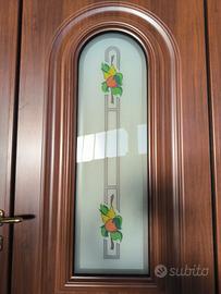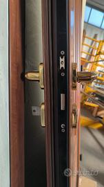 Porta d'ingresso nuova in alluminio taglio termico serie Domal con pannello in alluminio royal, vetro satinato. Colore finto legno lucido. Serratura a 3 punti di chiusura. Apertura sx spingere esterno.