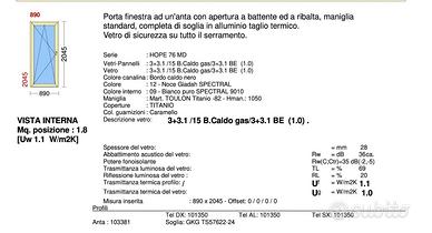 Porta finestra ad un'anta con apertura a battente ed a ribalta, completa di soglia in alluminio taglio termico. Vetro di sicurezza su tutto il serramento. misure 890 x 2045 NUOVA. VENDO PER ORDINE MISURE ERRATO TUTTE LE CARATTERISTICHE TECNICHE NELLA SCHEDA TECNICA IN FOTO PAGATA EURO 1200 SOLO RITIRO A MANO