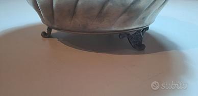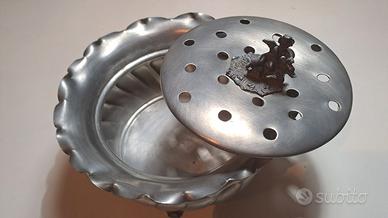 Vaso in peltro con coperchio con fori per inserire fiori secchi o semplicemente da usare come centro tavola. Ha il bordo ondulato e una decorazione centrale. Dimensioni: diametro cm.20, altezza cm.10,5